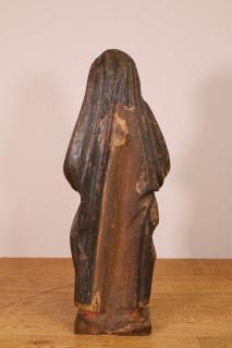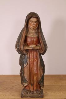 Heilige of wellicht voorstellende Maria Magdalena. Staand met gevouwen handen, de blauwe mantel opgehoogd met florale decoraties. Polychromie origineel (beschadigingen, restauraties).