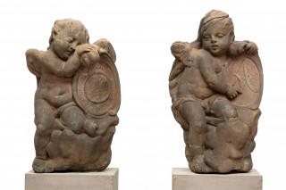 vormgegeven als putti met elk een schild. Eén schild voorzien van monogram 'Av'. Beide op twee latere basementen.