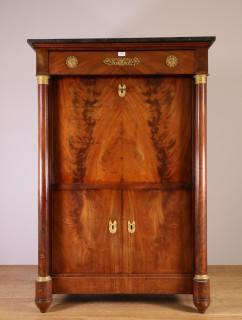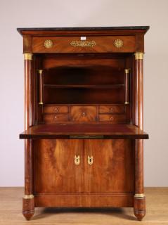 met natuurstenen blad. In het front een lade, twee deuren en openslaande schrijfklep, waarachter een interieur. Op de stijlen vrijstaande kolommen