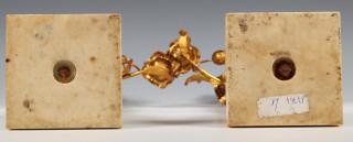 uitgevoerd met klassieke figuren van een man en een vrouw welke beide een urn dragen waar de met bloemen en bladeren gedecoreerde kaarsenhouders uitsteken. Geheel geplaatst op wit marmeren zuiltjes.