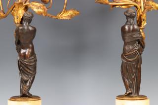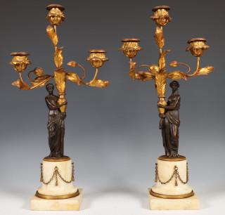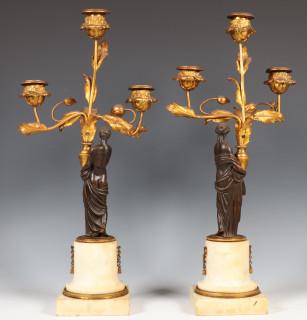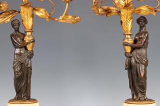A pair of Louis XVI period bronze and partly gilded candelabras. Depicting two classical figures standing on white marble bases. 18th century.