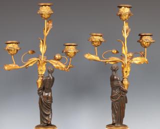 Frankrijk, een paar bronzen vuurvergulde en deels gepatineerde drie lichts kandelaars, Louis XVI periode;