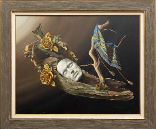 Stilleven met masker, gele rozen, tak en boomschors