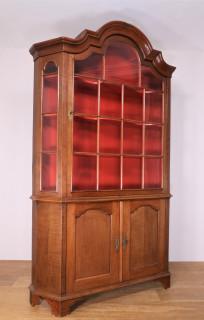 met onder de gecontourneerde kap een deur met ruiten in vakwerk. De onderkast met twee deuren