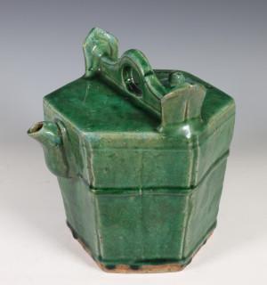 China, a green glazed earthenware wine jug, late Qing dynasty, the hexagonal jar covered with a thick, crackled glaze