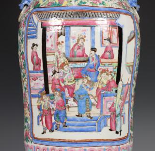 met famille rose decor van voorname figuren in paleis, ringdragende maskers als oor (hals met restauratie)