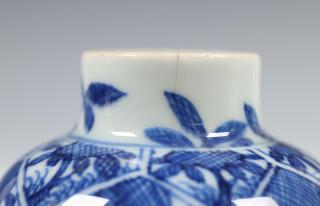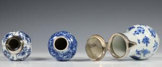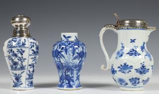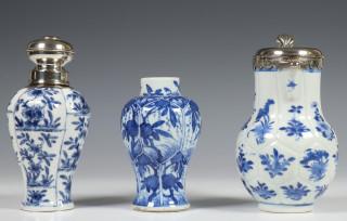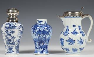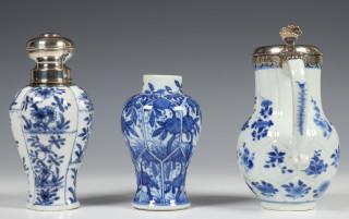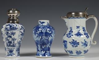 China, twee blauw-wit porseleinen vaasjes en een melkkan, Kangxi,
