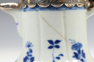 de zilvergemonteerde melkkan en een zilvergemonteerd gelobd vaasje met florale decoratie en een vaasje gedecoreerd met vruchtdragende takken (haarlijnen, enkele chips)