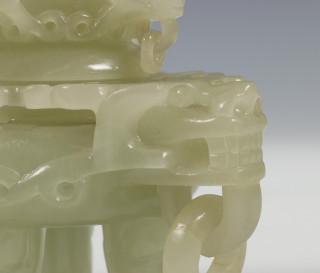 op driepoot, gesneden met leeuwenkoppen, de steen met een lichte celadon kleur