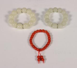 China, twee jadeïet kralenarmbanden en een koralen kralenarmband
