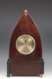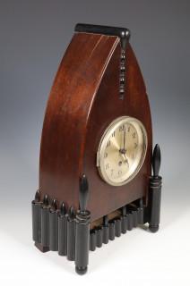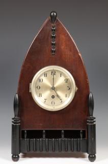 druppel vormige houten kast met gezwarte ornamenten. Verzilverde wijzerplaat waaronder langwerpig slingervenster met pilaartjes. (beschadigingen, slinger manco).