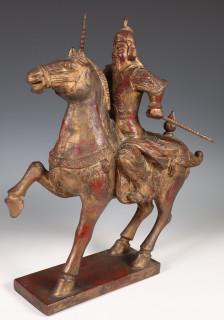 China, a wood sculpture of an equestrian Tang warrior, ca. 1950, remains of gilt and red lacquer (repaired)