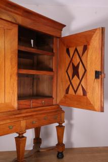 met onder de rechte kap twee deuren met aan de binnenzijde stervormig inlegwerk. De onderkast met twee laden. Op vijfkantige, ballustervormige poten