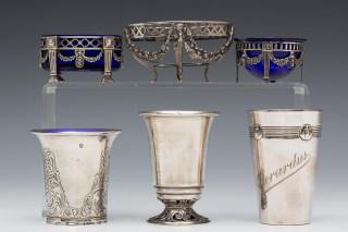 hierbij drie zoutvaatjes met blauw glazen binnenbakjes ( incompleet en defect ), één beker gegraveerd mt. J.G. Meijer sr. Amsterdam 1828-1860, 1e gehalte,