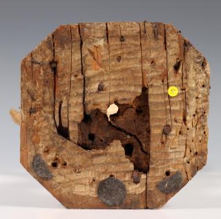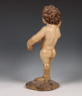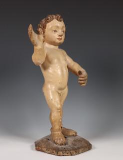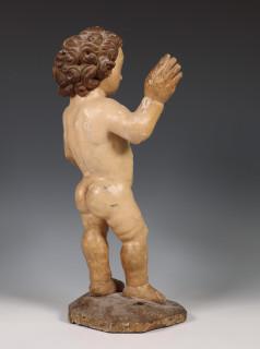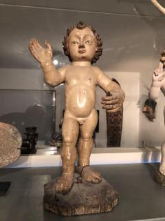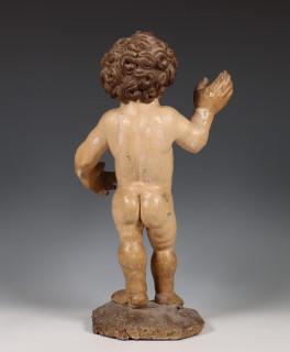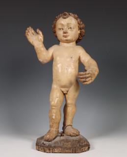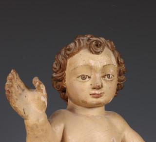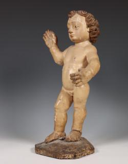 met een opgeheven hand en beschilderde ogen. Met oude polychromie (beschadigingen).