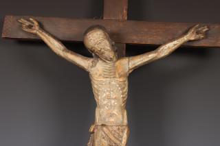 met resten van polychrome beschildering. Gemonteerd op een modern kruis.
