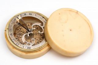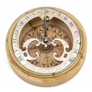 Fijn gegraveerde zilveren zonnewijzer in ivoren doosje, ges. Gerardus Brand fecit Amfterdmi, 17e eeuw;
