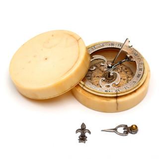 A rare Dutch silver sundial in a turned ivory case, signed Gerardus Brand fecit Amfterdmi, mid 17th century. Another example sold through Christie's 21-22 September 2010, The decorative Arts Sale, lot