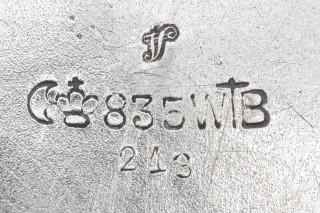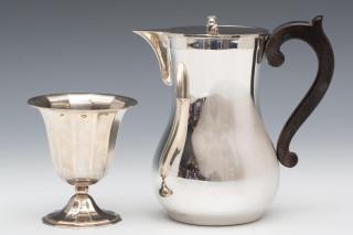 omgekeerd balustervormig met voluutvormig houten oor, mt. Wilhelm Binder, Schwäbisch Gmünd 1868-, 2e gehalte, vaasje mt. Zilverfabriek Voorschoten 1929, 2e gehalte