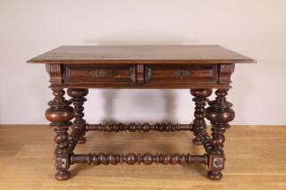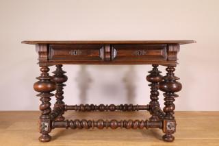 met twee laden. Op vier -door getorste regels verbonden- gedraaide en getorste poten (hoek blad besch.) Geen sleutel