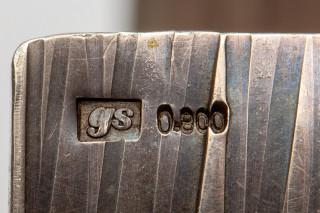 Structuur is verkregen door een plaat zilver met een bijl te hameren, daarna walsen en dit proces een aantal keer te herhalen. Gemerkt GS (Galerie Schobinger) en 0800
