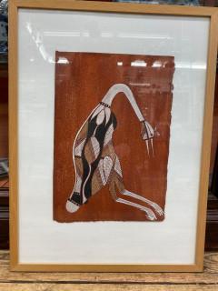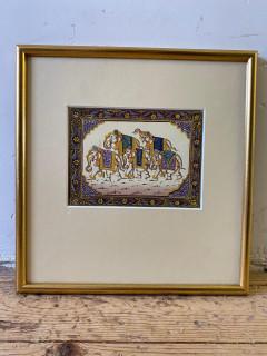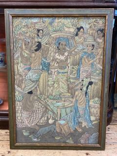 Een Indiase schildering, een Aboriginal schildering en een Balinese fijnschildering. Ingelijst.