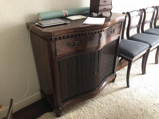 met -later aangebracht- opklapbaar glasbuffet. In het gebogen front lade en twee jaloeziedeuren
