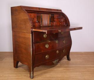 in twee verdelingen. De bovenkast met uittrekbaar schrijfblad en oprolbare cilindervormige klep, waarachter een interieur. De onderkast met gebombeerd front, waarin drie laden. (Met gebruikssporen en kleine fineerschade)