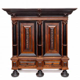 met rechte kap, waaronder twee deuren. In de voet een lade. Uitgevoerd met kussenvormige panelen, halve kolommen, robbellijstwerk en gestoken leeuwenkoppen, -kapitelen en -ranken. Op gezwarte bolpoten