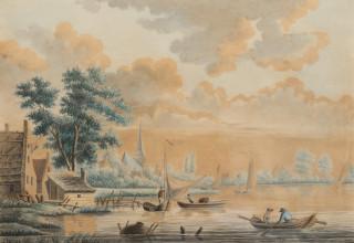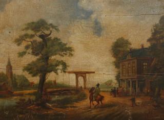 Figuren bij een herberg / Gezicht op een dorpje aan een vaart