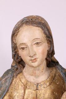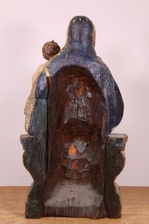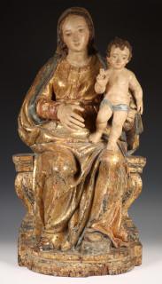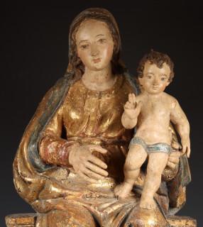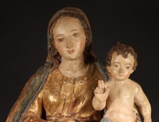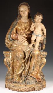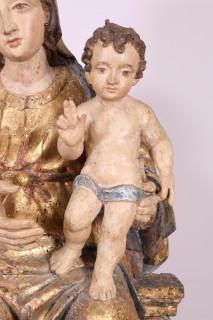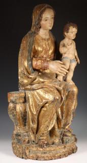 Madonna met Christuskind op de knie, gezeten met verguld mantel op plint met voluten. De gezichten met polychroom (reconstructies, o.a. rechterhand later)