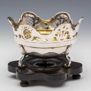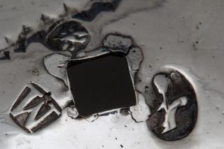 rond met gecontourneerde en ajour rand op drie gekrulde pootjes staand op gezwart houten voet, mt. Johannes van Urck 1778, Middelburg jaarletter M=1780 of W=1796, 2e gehalte