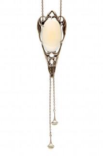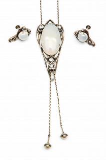 Schuif bezet met een ovale agaat, montuur met florale motieven in Art-Nouveau stijl. (collier versleten). Gemerkt R4. Hierbij een paar oorschroeven