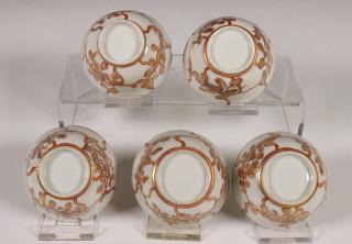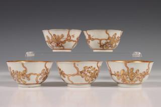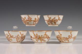 China, een set van vijf vergulde en ijzerrood-gedecoreerde koppen en schotels, 18e eeuw,