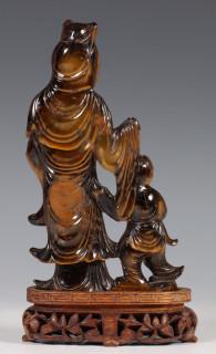 China, a harstone carving, ca. 1900, depicting a lady and a boy, on wood stand (small chips)