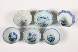 China, a collection of blue and white porcelain, Kangxi and later, comprising a set of four lobed saucers, a single saucer, six various cups and three spoons (single saucer repaired, some chips and hairlines)