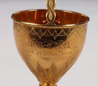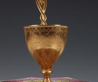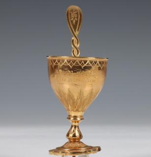 Twee 14krt. gouden bekers ter viering van een 50 jarig jubileum en twee 18krt. gouden lepels, 19e eeuw,