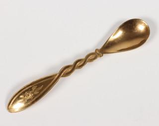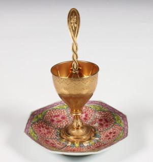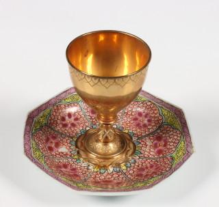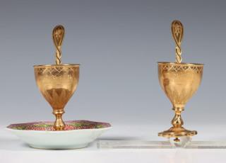 two gold cups, one mounted on a porcelain saucer and two 18 ct gold spoons. 19th century.
