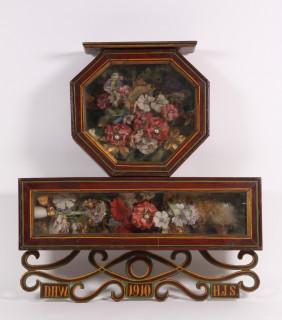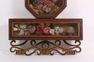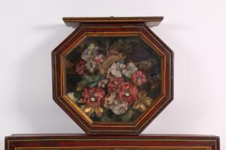 Meekrap geschilderde wandvitrine zgn. 'bruidegomspijp' met achter glas pijp en zijden bloemen