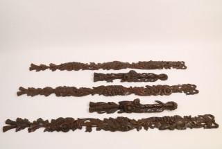drie lange gestoken stijlen uitgevoerd met strik ornament, zonnebloemen en eikenbladeren. Hierbij twee kleine stijlen.