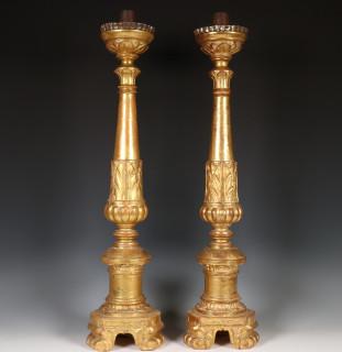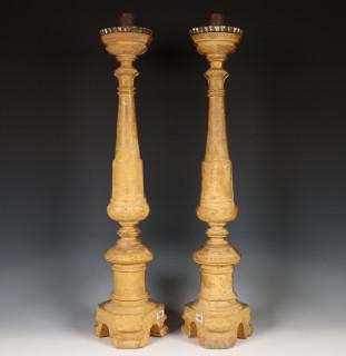 Italië, paar vruchtenhouten vergulde éénlichts kandelaars, 20e eeuw;