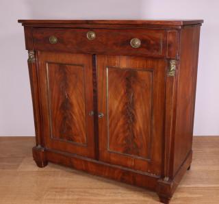 met twee deuren en lade met openslaande front, waarachter een interieur. Op de hoekstijlen deels verguld bronzen kariatiden. Het geheel versierd met messing bieswerk (ontbreekt deels)