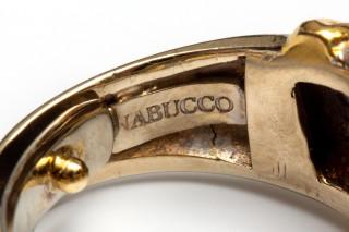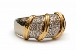 bovenzijde pavé bezet met briljant geslepen diamanten. Lijkt omwikkeld met een dubbele geelgouden draad. (Aan de binnenzijde plaatje en balletjes gesoldeerd, i.v.m. verkleining, signatuur gedeeltelijk leesbaar Nabucco)