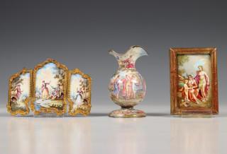 met gelobte kraag, (beschadigingen). Hierbij een geëmailleerd miniatuur scherm met voorstellingen van figuren in landschap en een geëmailleerde kleine plaque met beeltenis van Mercurius, 19e eeuw.