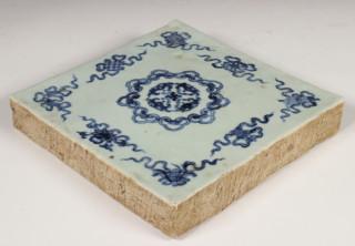China, blue and white glazed 'buddhist' tile, decorated with ruyi and buddhist symbols, probably 19th century