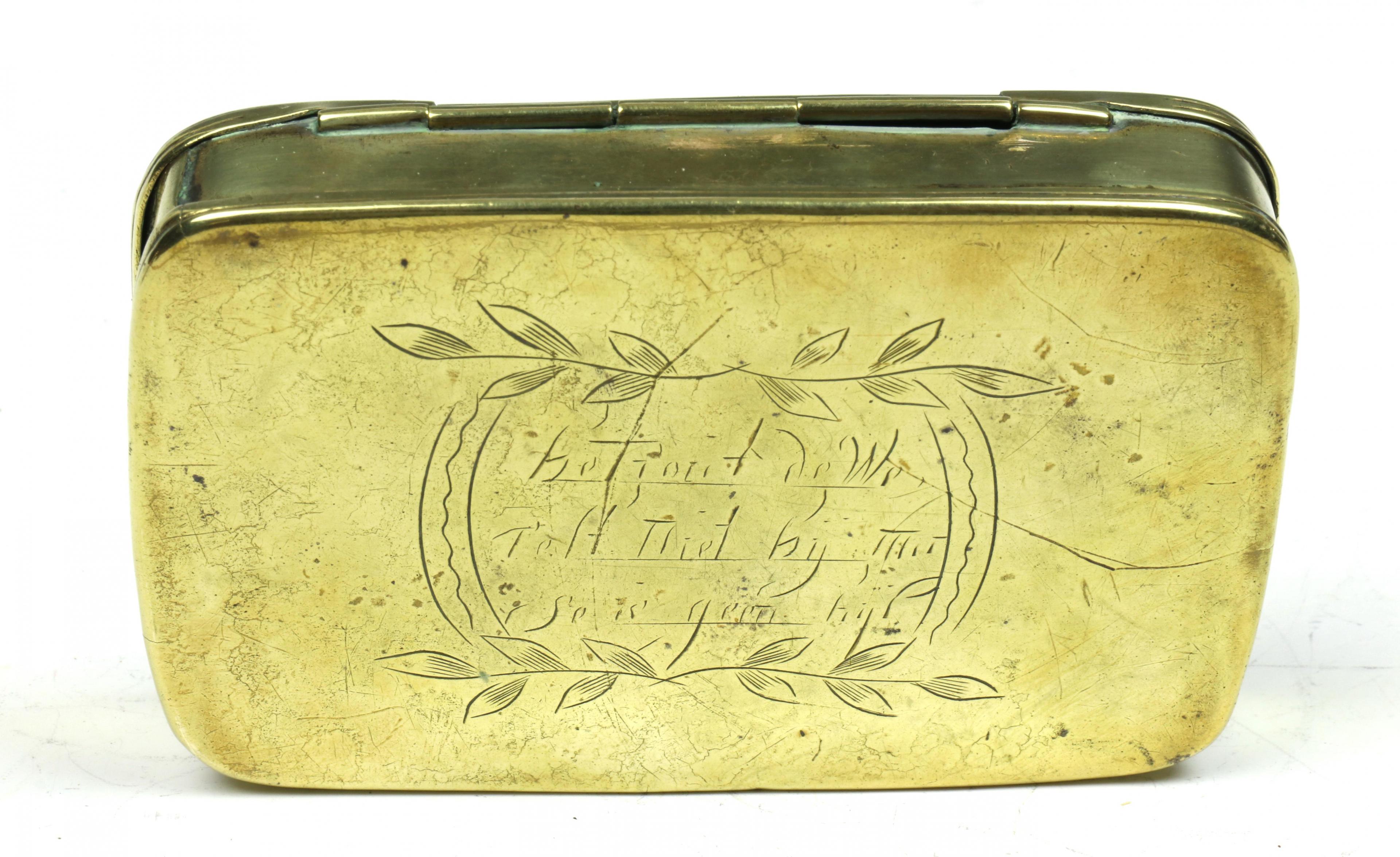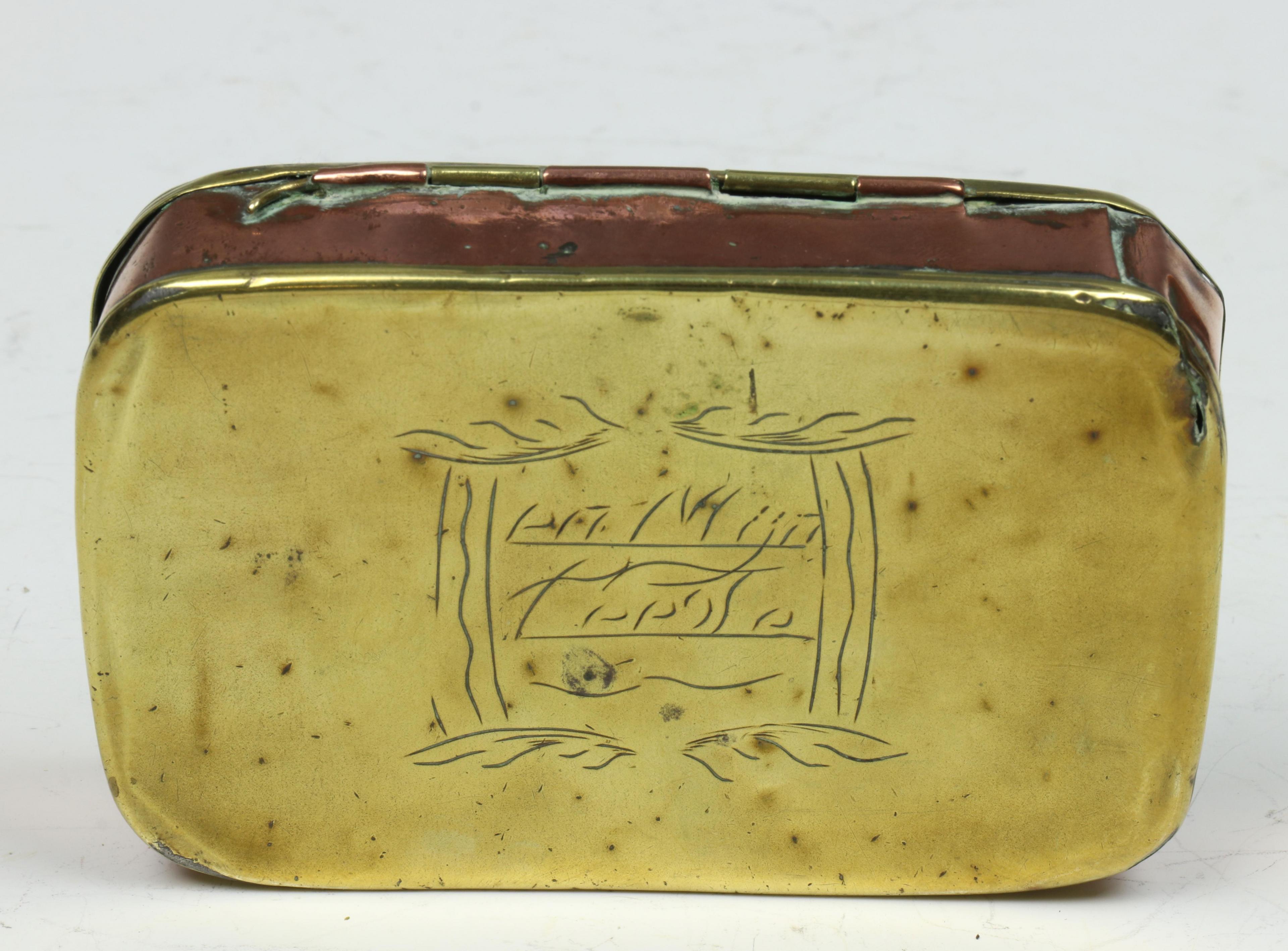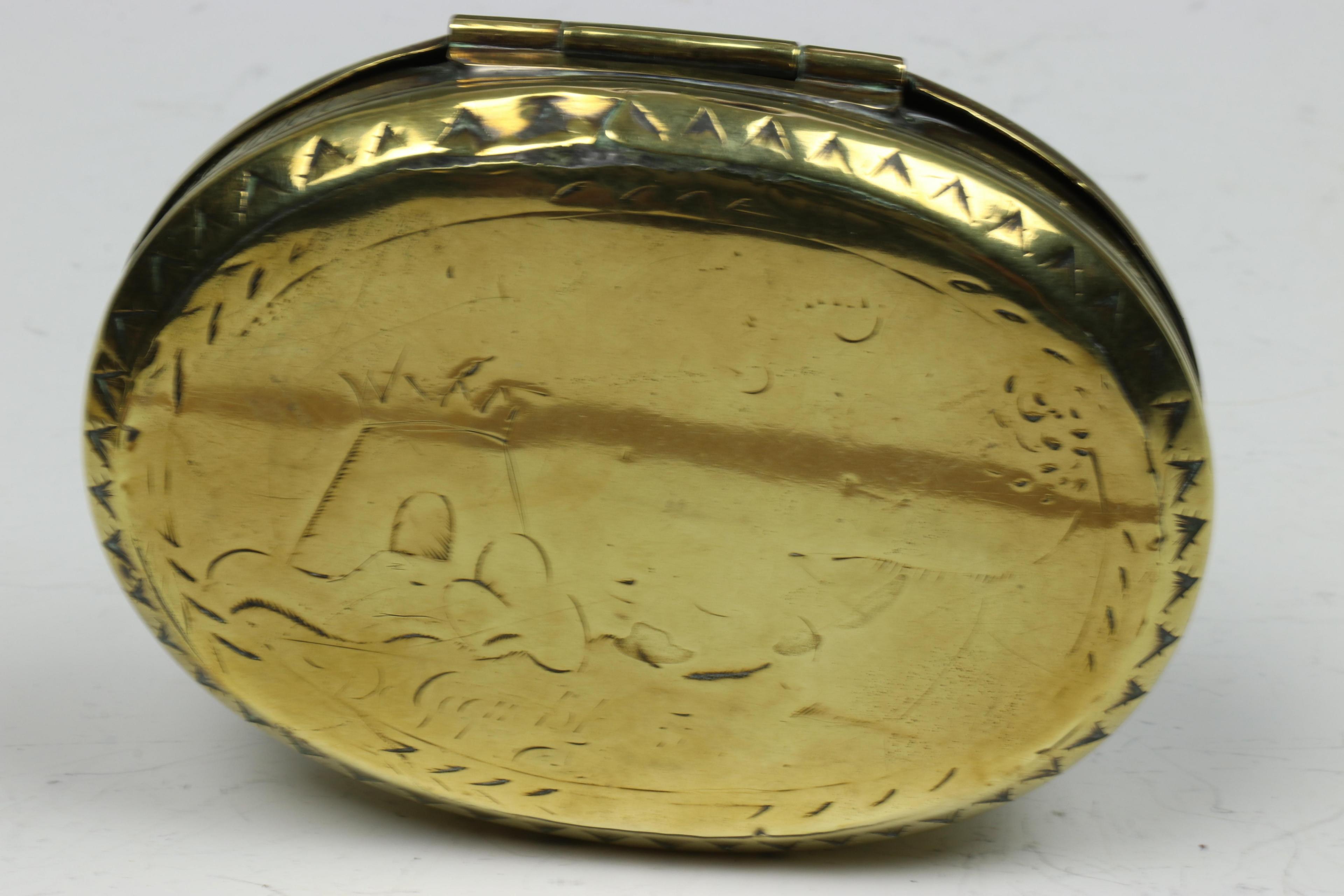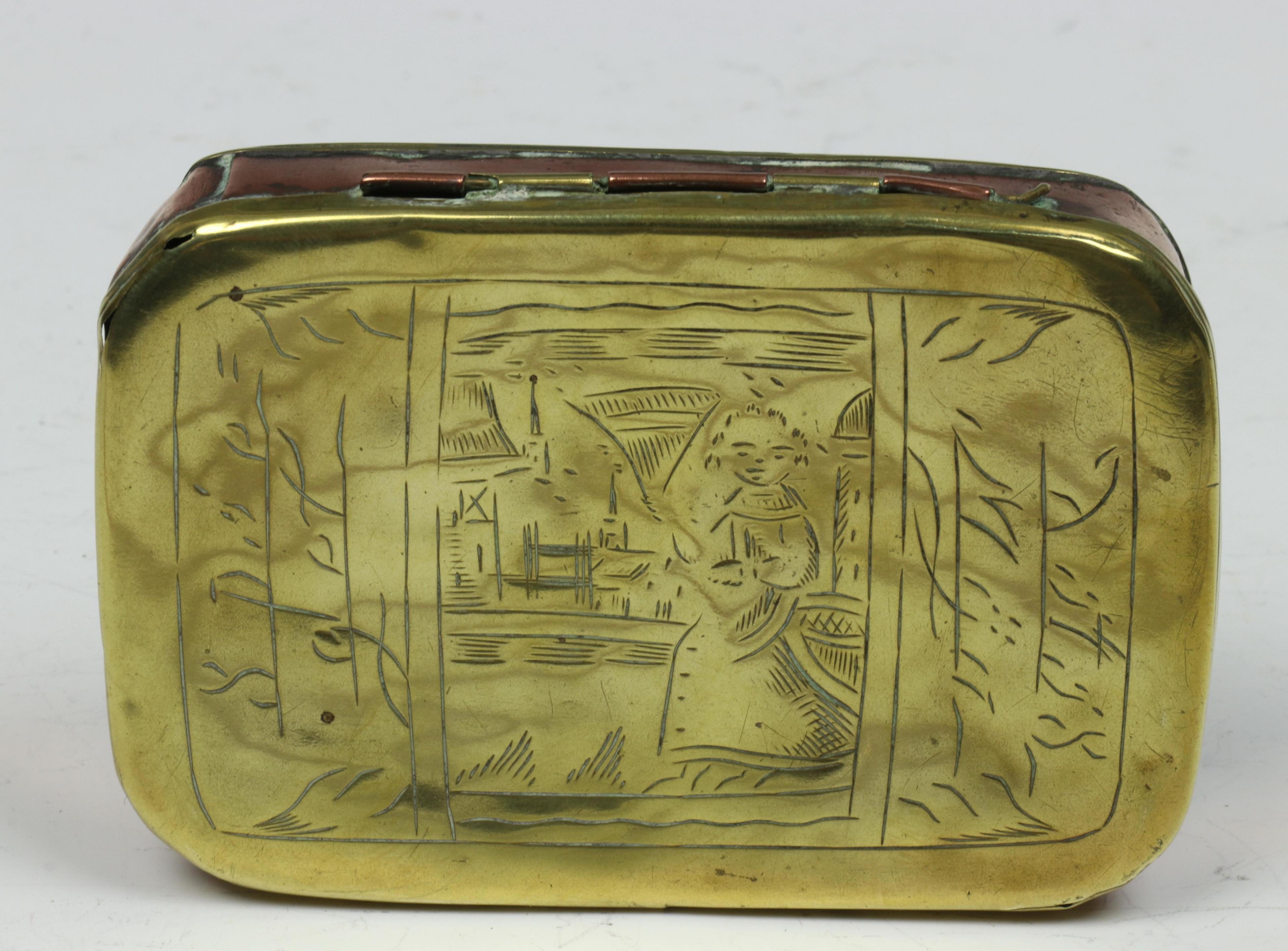Holland, drie geel koperen gegraveerde tabaksdozen, 18e eeuw,