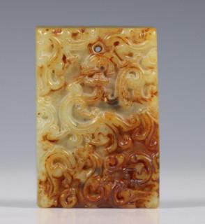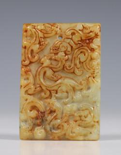 China, a rectangular jade pendant, carved with chilong dragons, the stone of a celadon and russet tone