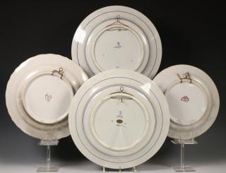 De Porceleyne Fles, twee blauw aardewerk schotels en Makkum, par polychroom schotels, 20e eeuw