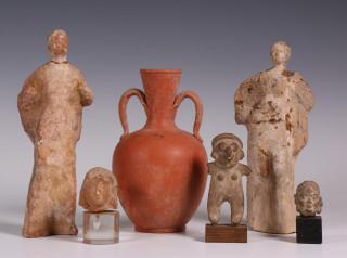 two Tanagra female figures, ca. 4th century BC. Roman terra sigilata vase, 2nd century. Two terracotta female bustes and one Precolumbian earthenware figure. (with damages)