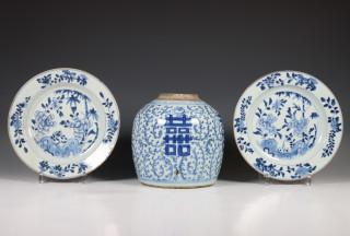 China, paar blauw-wit porseleinen borden, Qianlong en gemberpot, 19e eeuw,